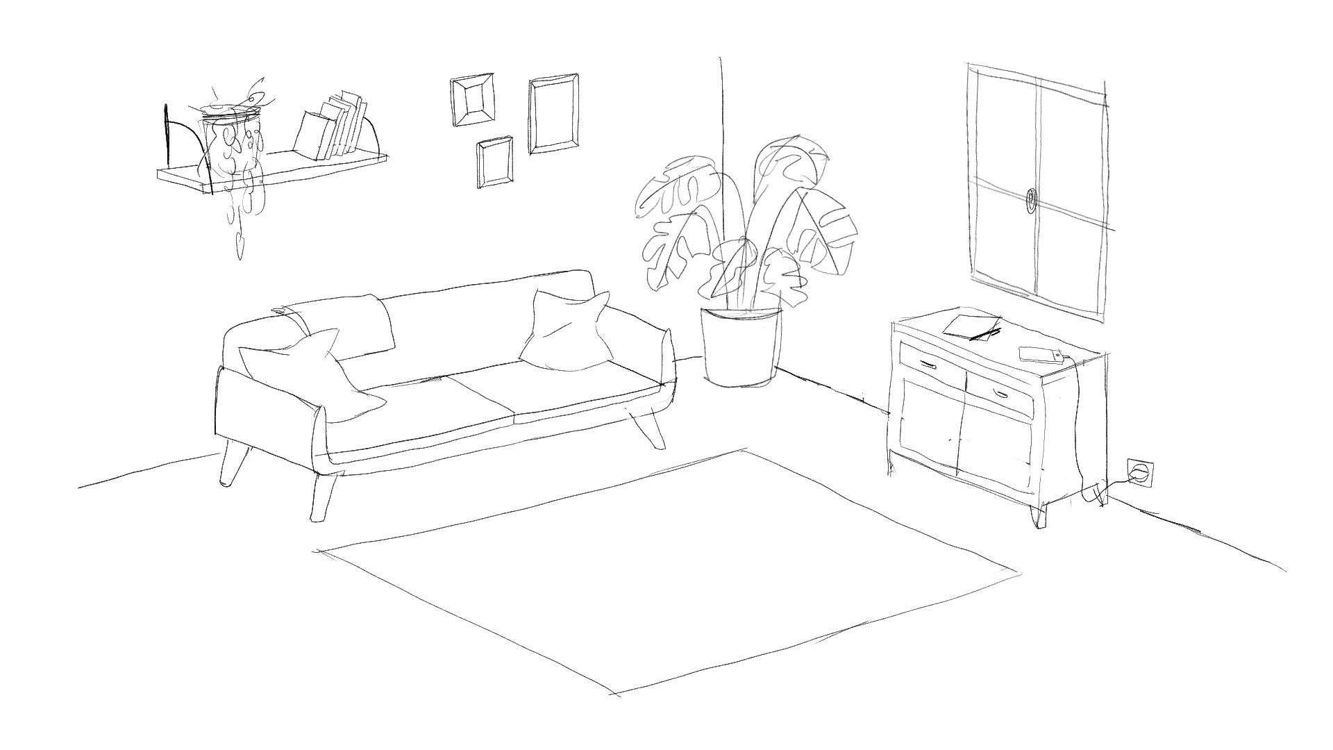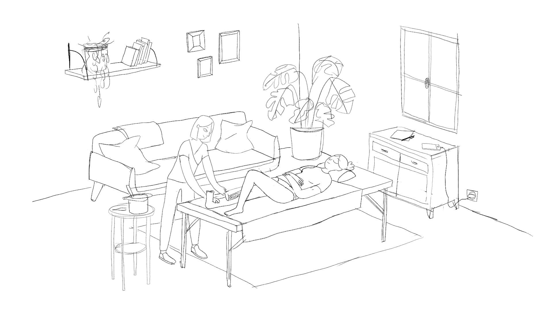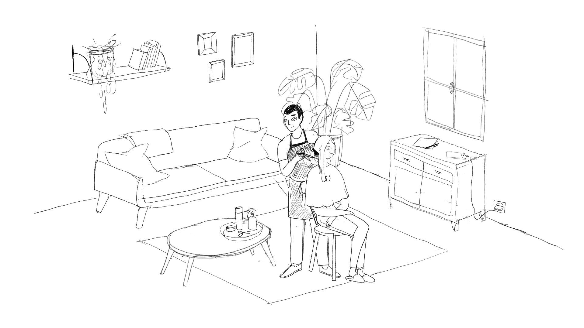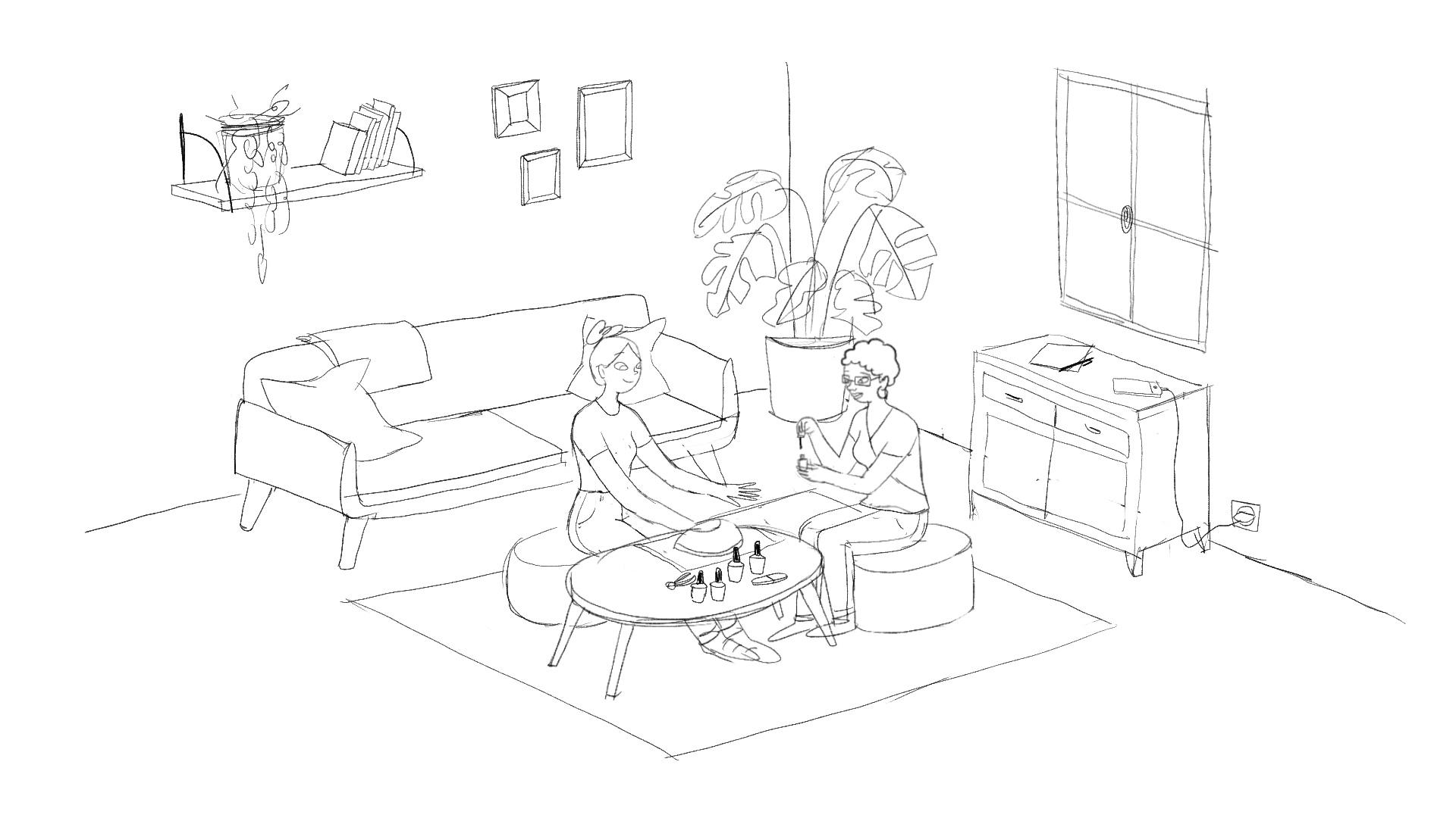 Léna Piroux a travaillé sur 4 « roughs » principaux avant de produire les illustrations finales. Ces roughs représentent le salon de la cliente, vide. Puis tour à tour les scènes d’épilation, manucure et coiffure. La colorisation a été effectuée en utilisant la palette de couleurs utilisées dans la charte graphique Wecasa : orange vitaminé, orange pêche, turquoise, bleu canard et gris souris.