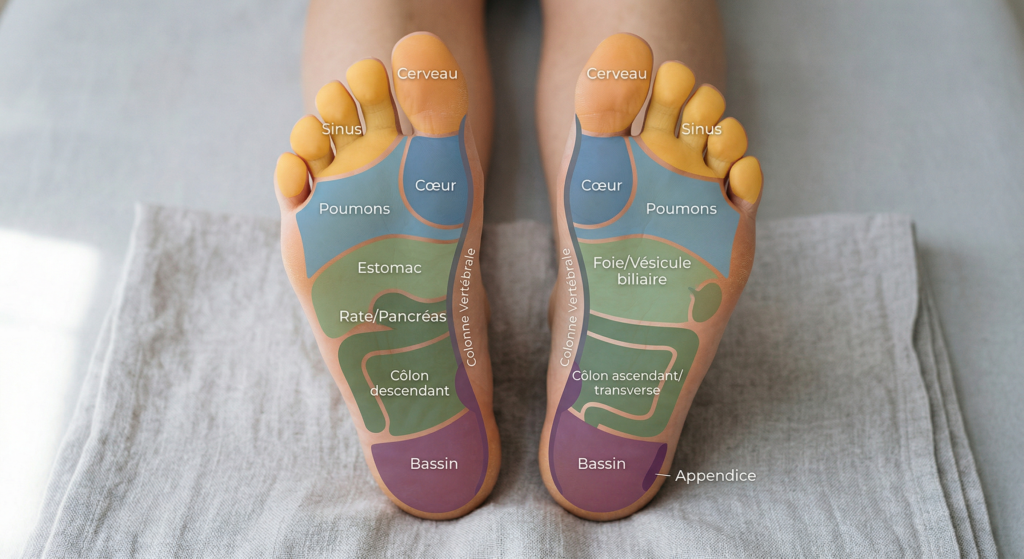 La réflexologie plantaire repose sur un principe simple : chaque zone du pied correspond à un organe ou une fonction précise. Pour s’y retrouver, la carte de réflexologie plantaire est l’outil de référence indispensable. Ce guide décrypte pour vous la cartographie du pied, des orteils au talon.