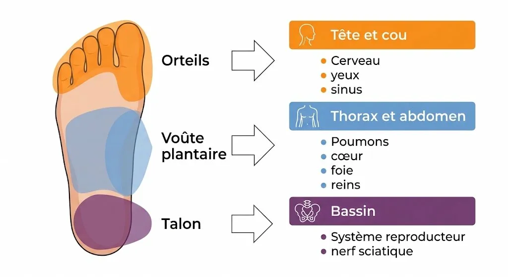 Les orteils sont liés à la tête et aux sinus, la voûte plantaire aux poumons, au cœur et aux intestins, le talon aux organes reproducteurs. Le pied droit reflète les organes de droite comme le foie, le pied gauche ceux de gauche comme le cœur et la rate.